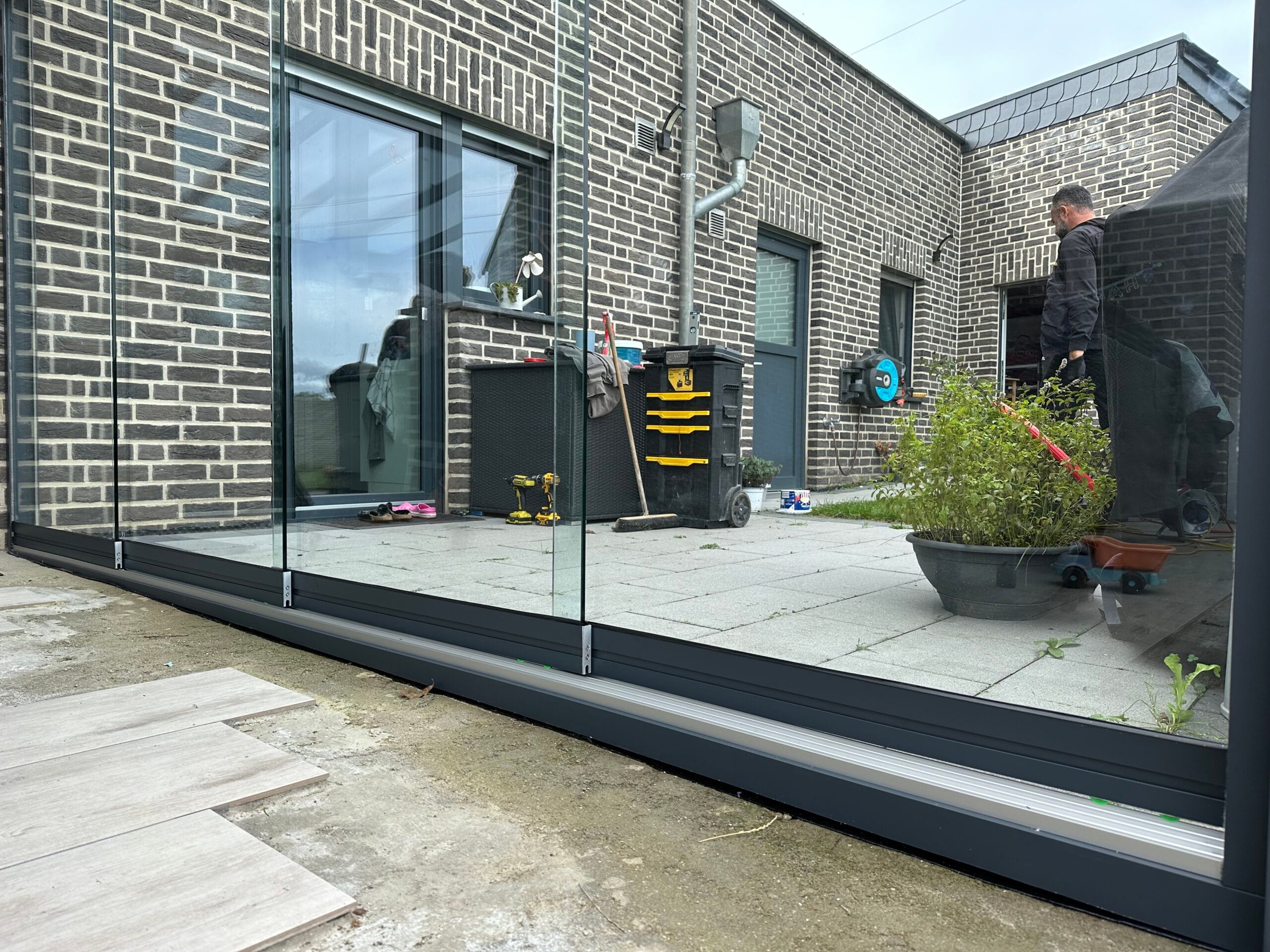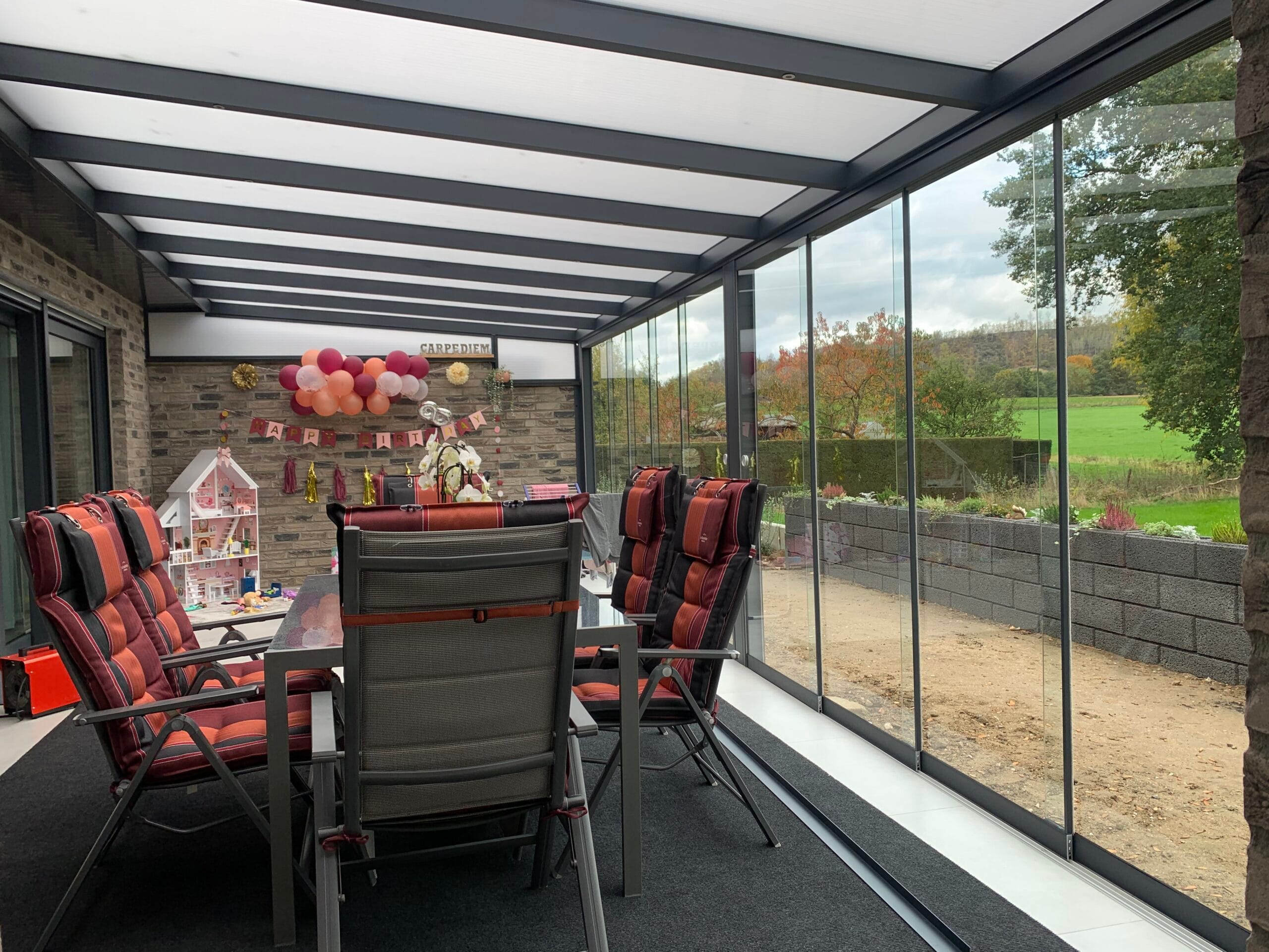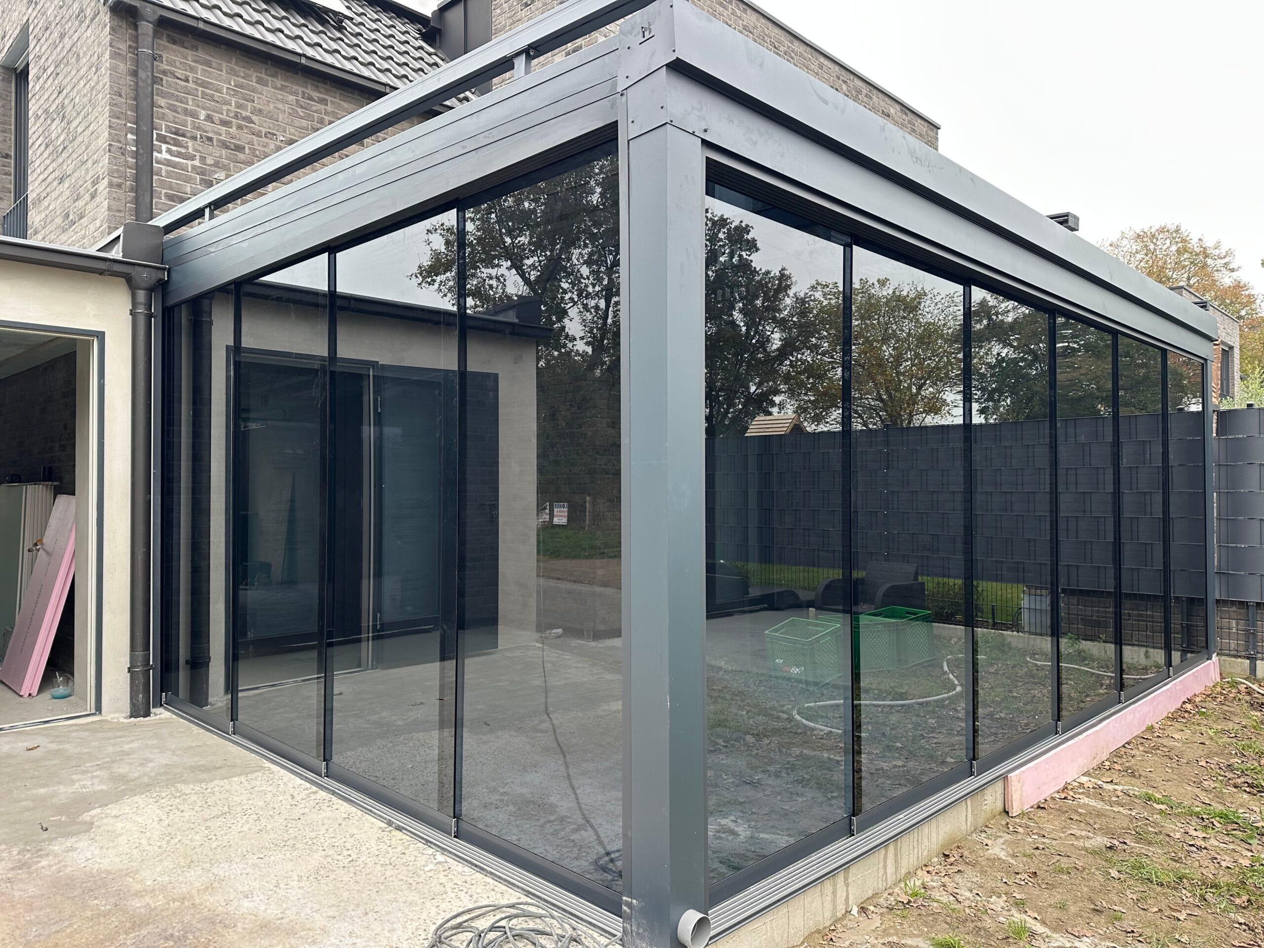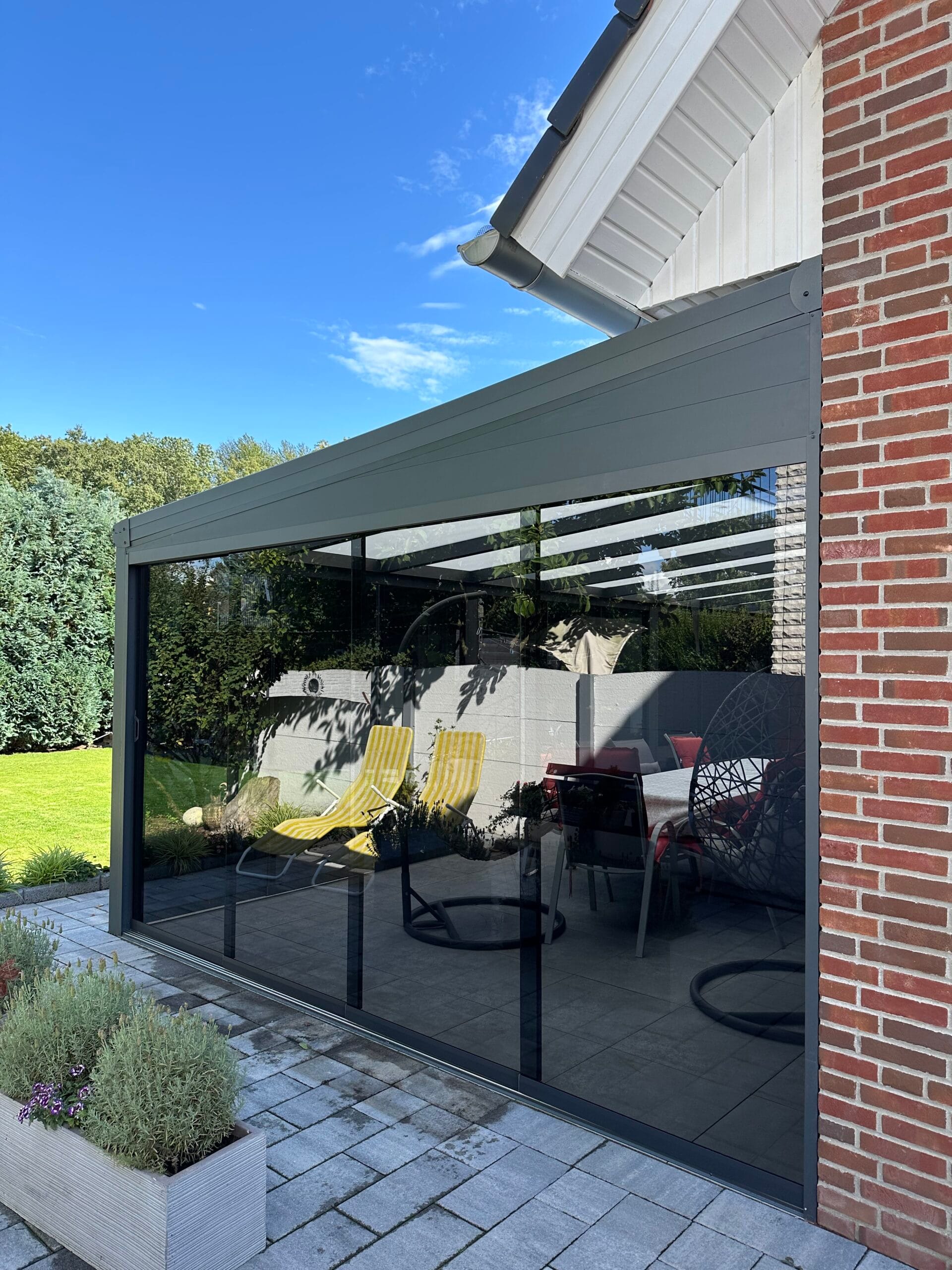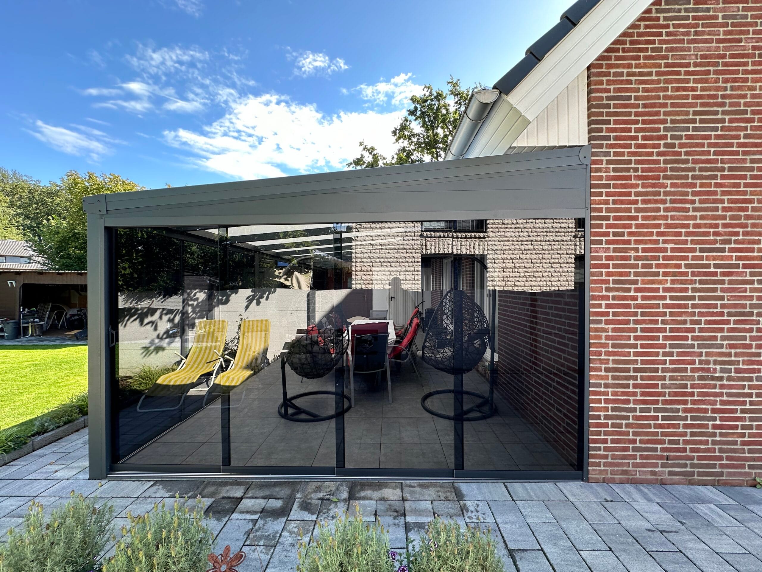 Wählen Sie aus verschiedenen Farben der Profile, die auf Ihre Terrassenüberdachungen abgestimmt sind. Das Glas ist in klar, satiniert oder verdunkelt erhältlich. Unsere hochqualitativen Schienenprofile sind geräuscharm und stoppen Zugluft durch innovative Bürstenprofile. Unregelmäßigkeiten im Boden lassen sich durch Unterlegprofile und Streifenfundamente problemlos ausgleichen, was zu einem reibungslos laufenden System führt