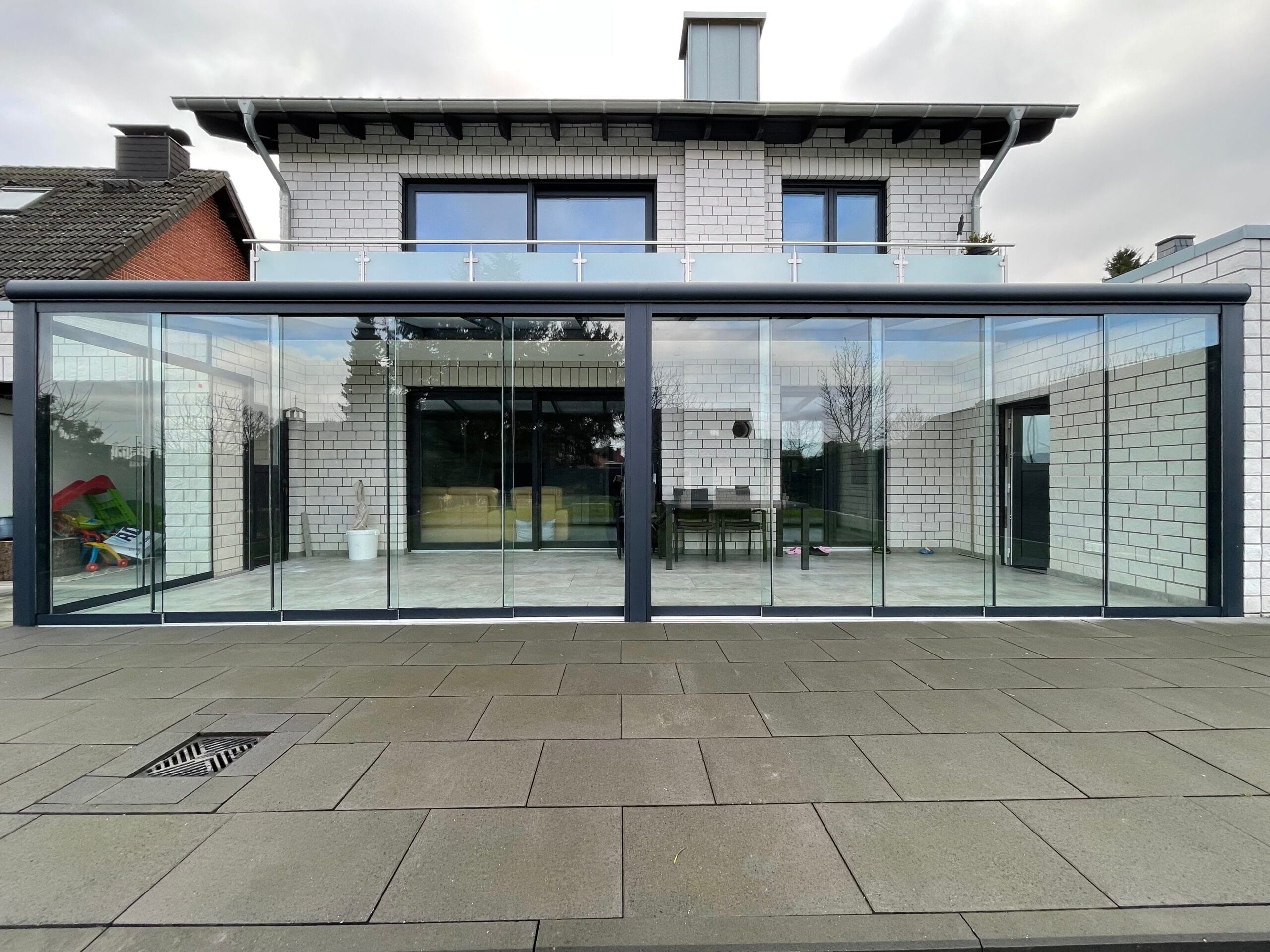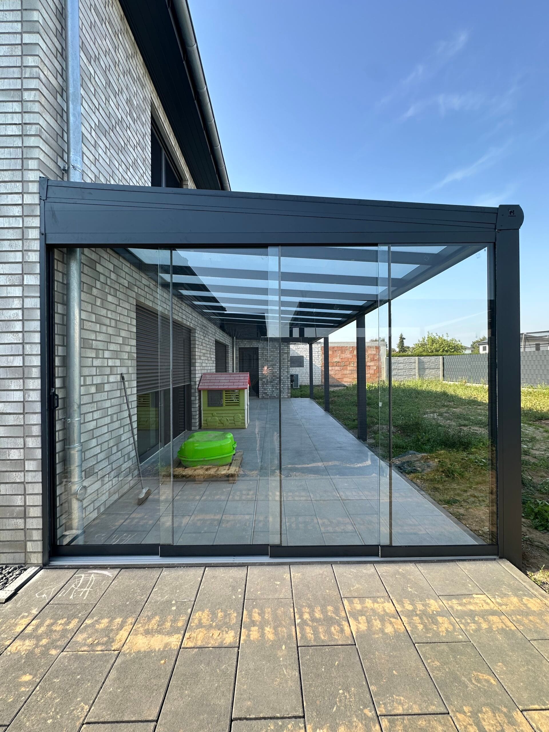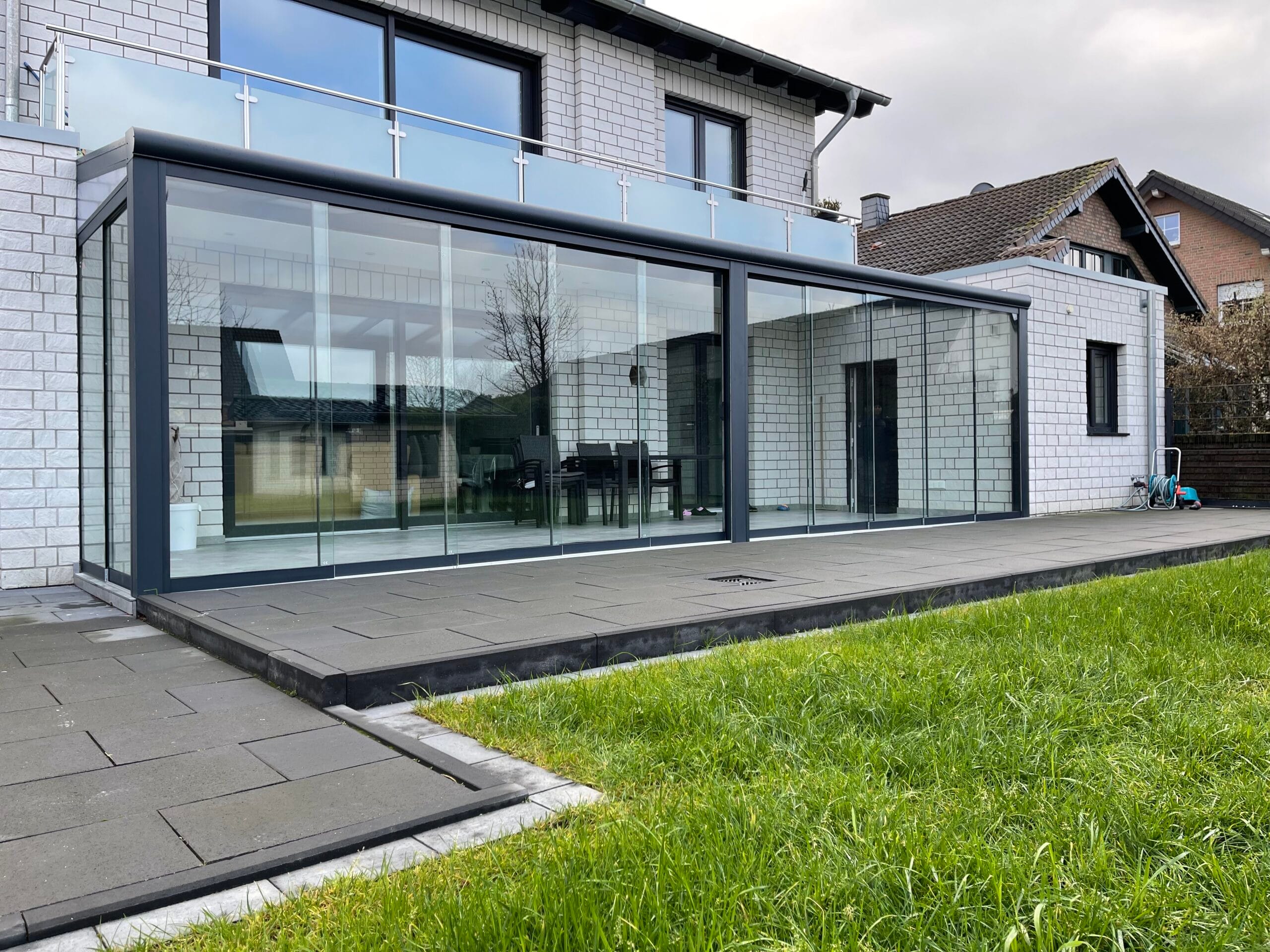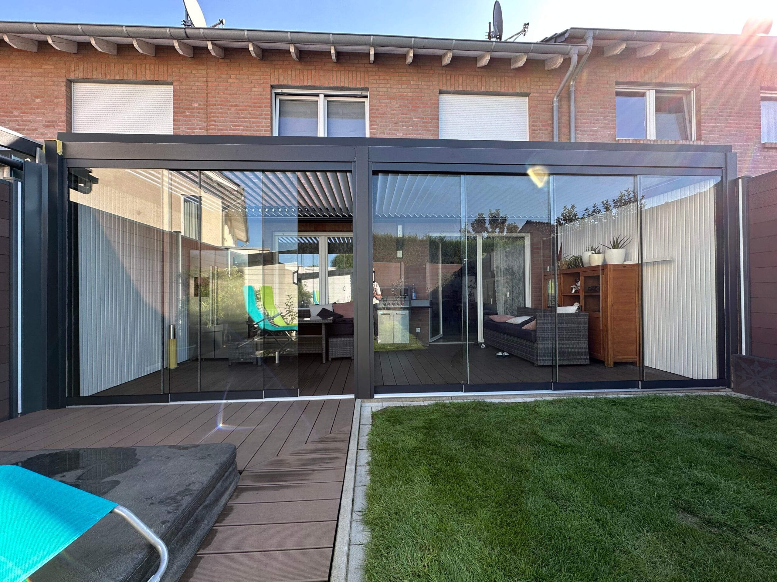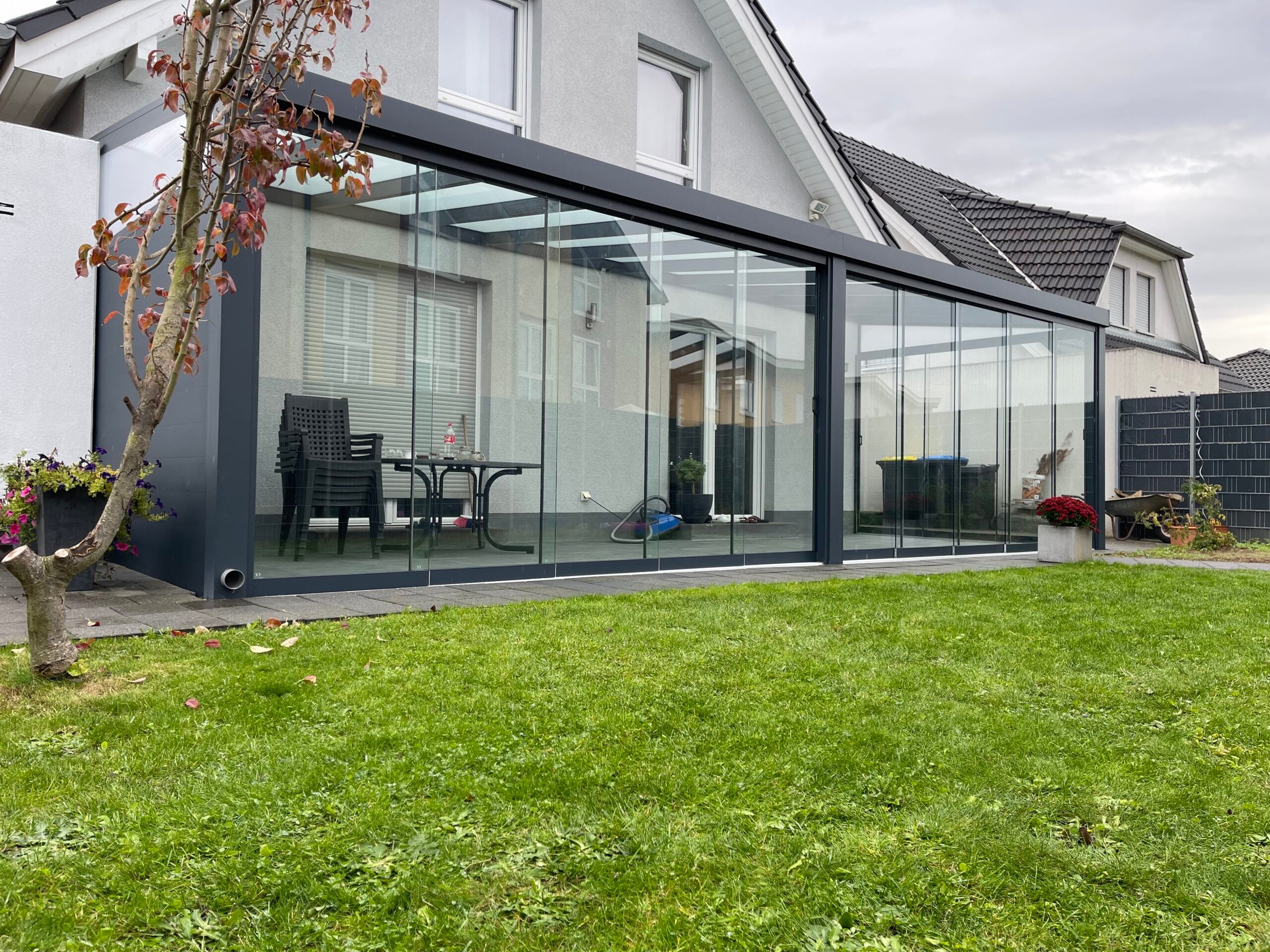 Wählen Sie aus verschiedenen Farben der Profile, die auf Ihre Terrassenüberdachungen abgestimmt sind. Das Glas ist in klar, satiniert oder verdunkelt erhältlich. Unsere hochqualitativen Schienenprofile sind geräuscharm und stoppen Zugluft durch innovative Bürstenprofile. Unregelmäßigkeiten im Boden lassen sich durch Unterlegprofile und Streifenfundamente problemlos ausgleichen, was zu einem reibungslos laufenden System führt