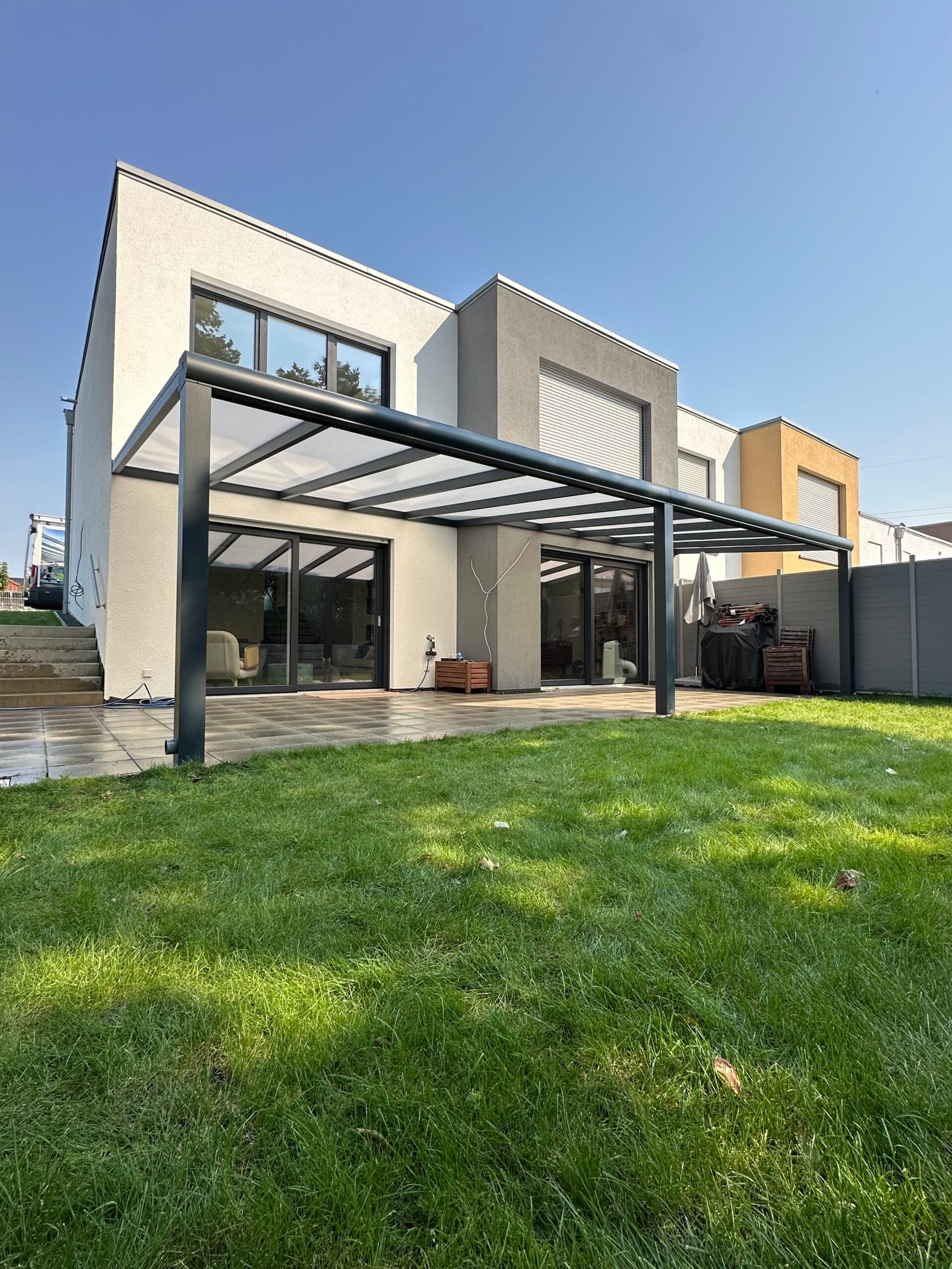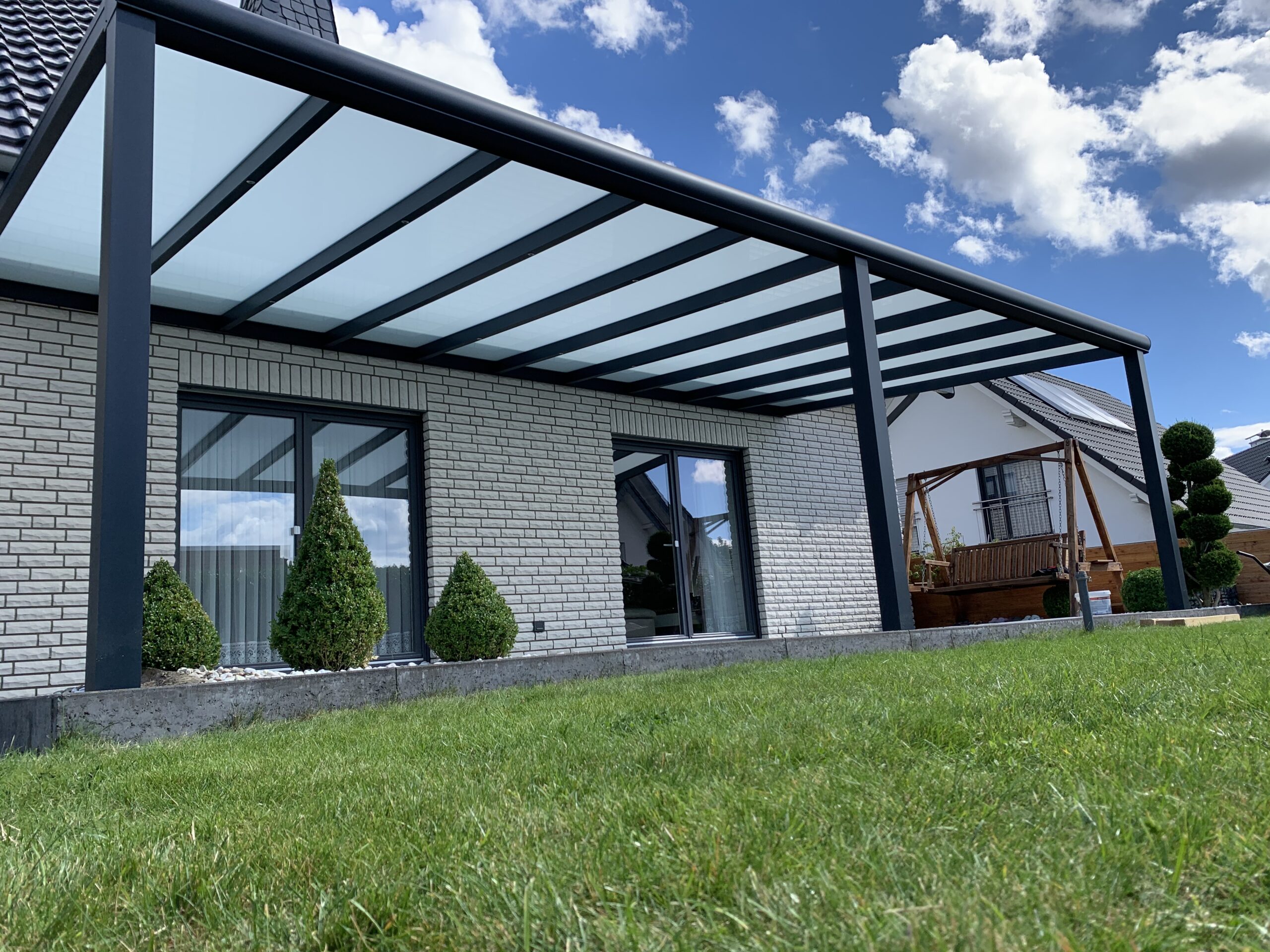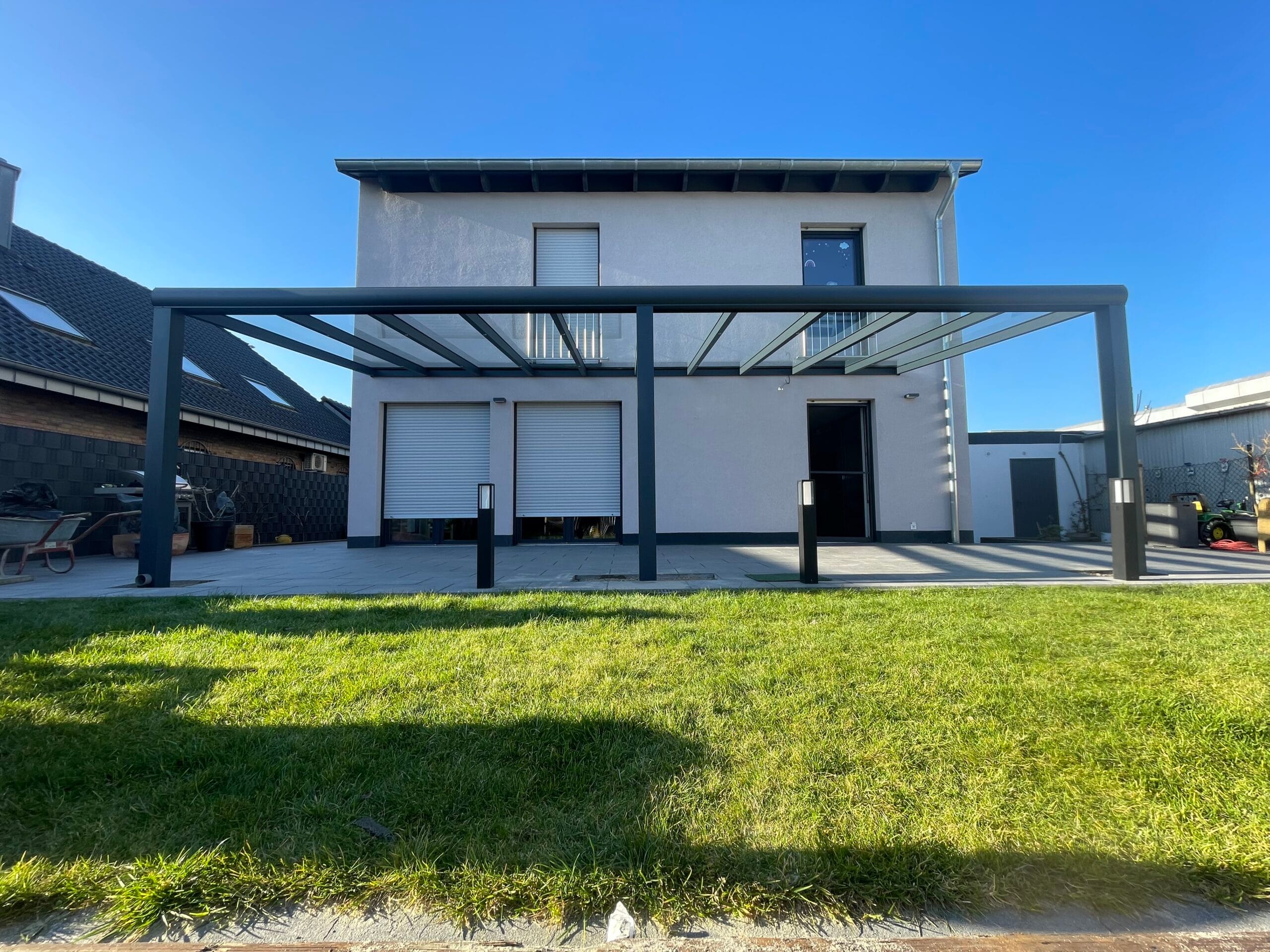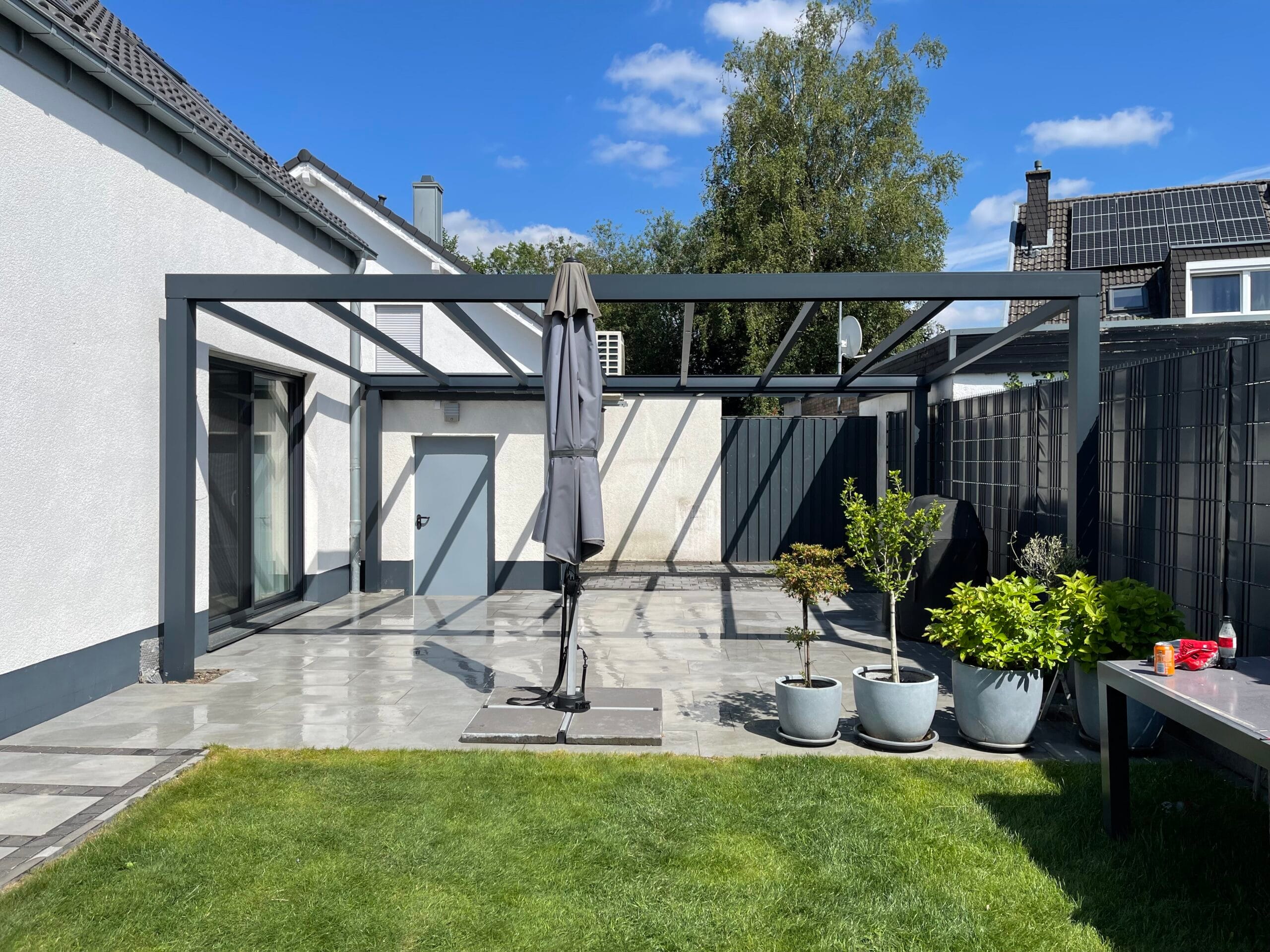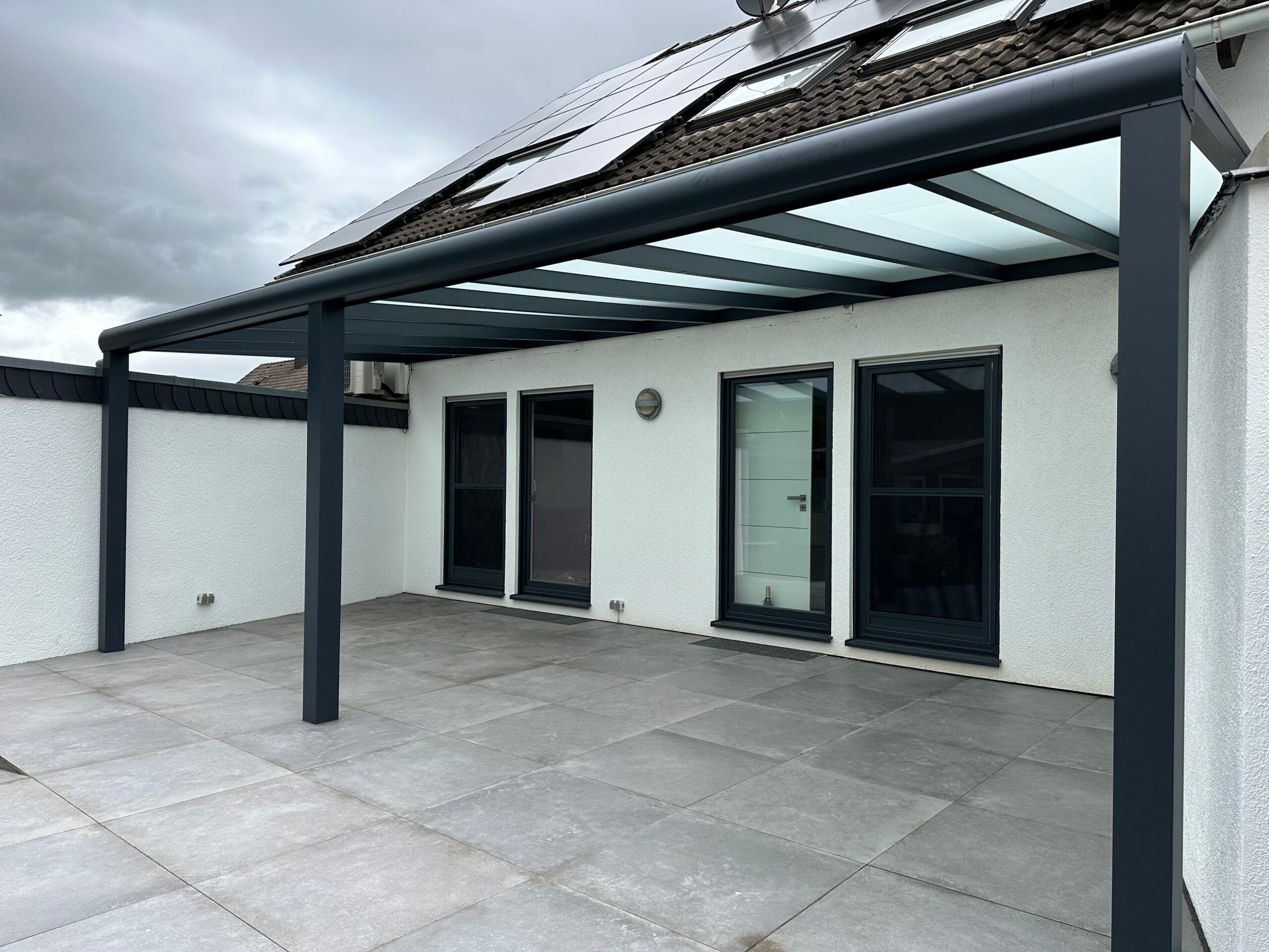 Unsere Terrassenüberdachungen vereinen modernes Design und Funktionalität. Sie sind nicht nur ästhetisch ansprechend, sondern bieten auch eine robuste Struktur mit einem Statikträger von bis zu 7 Metern Breite auf 2 Pfosten. Diese starken Konstruktionen garantieren Stabilität und Langlebigkeit.