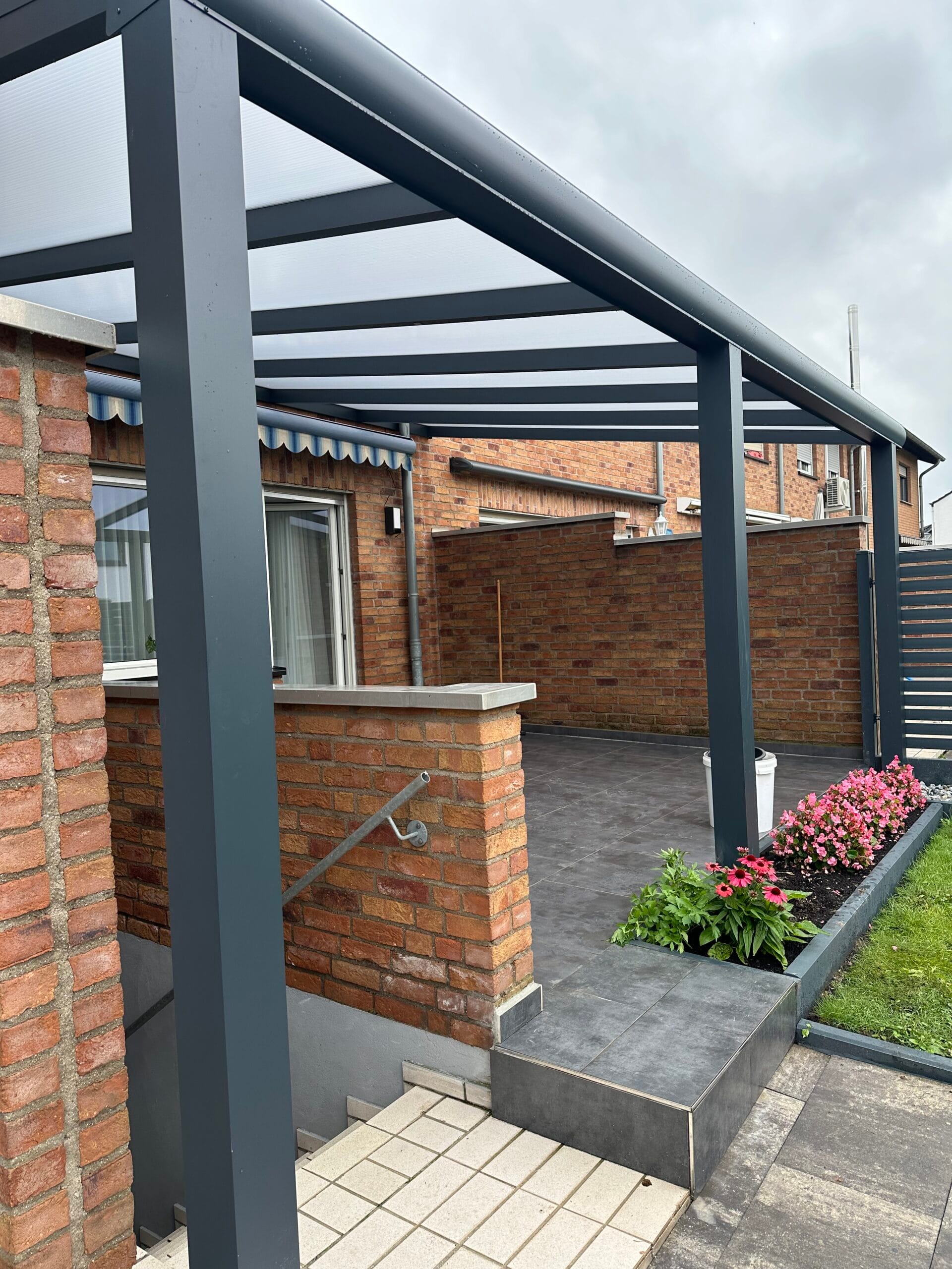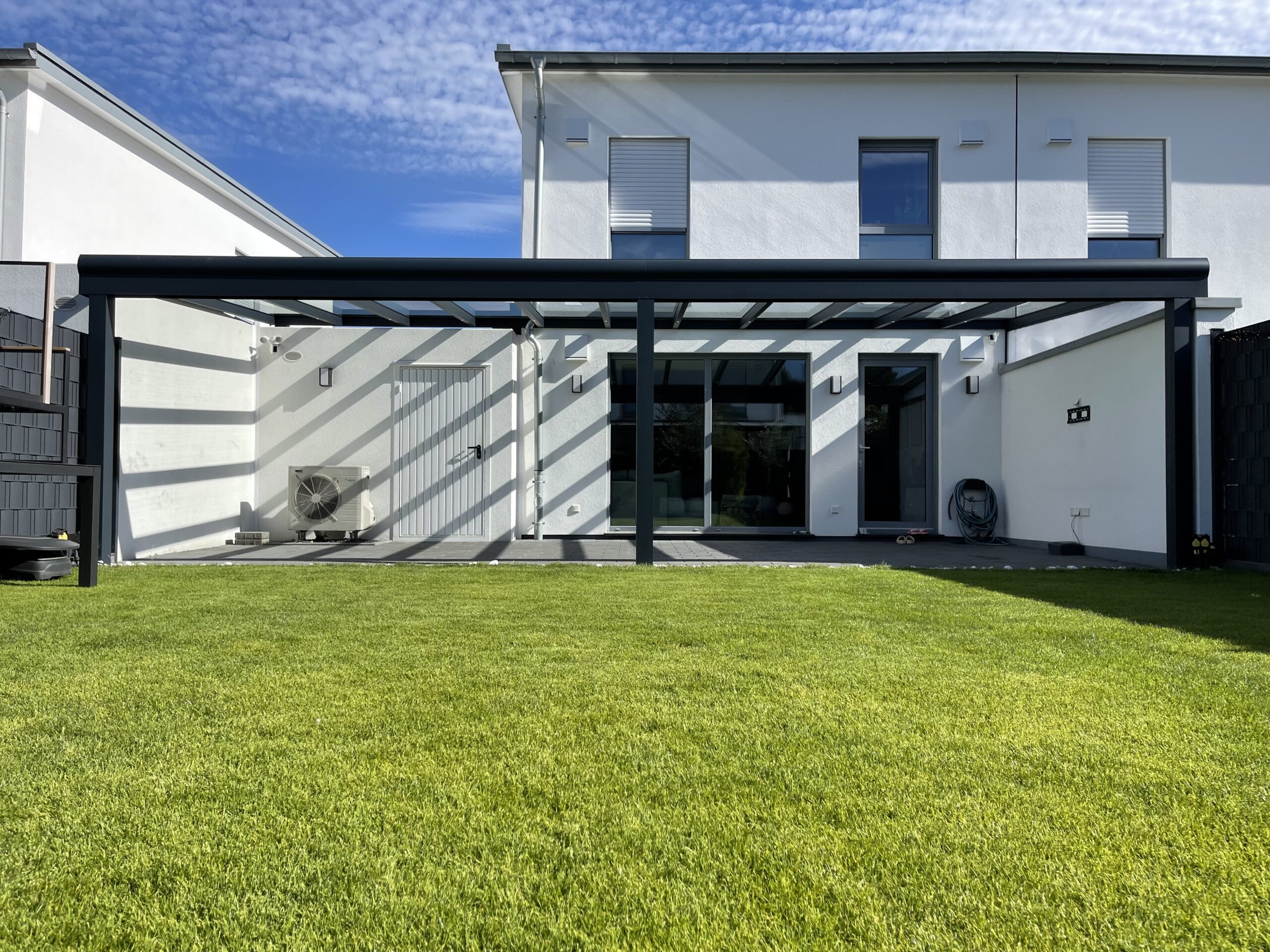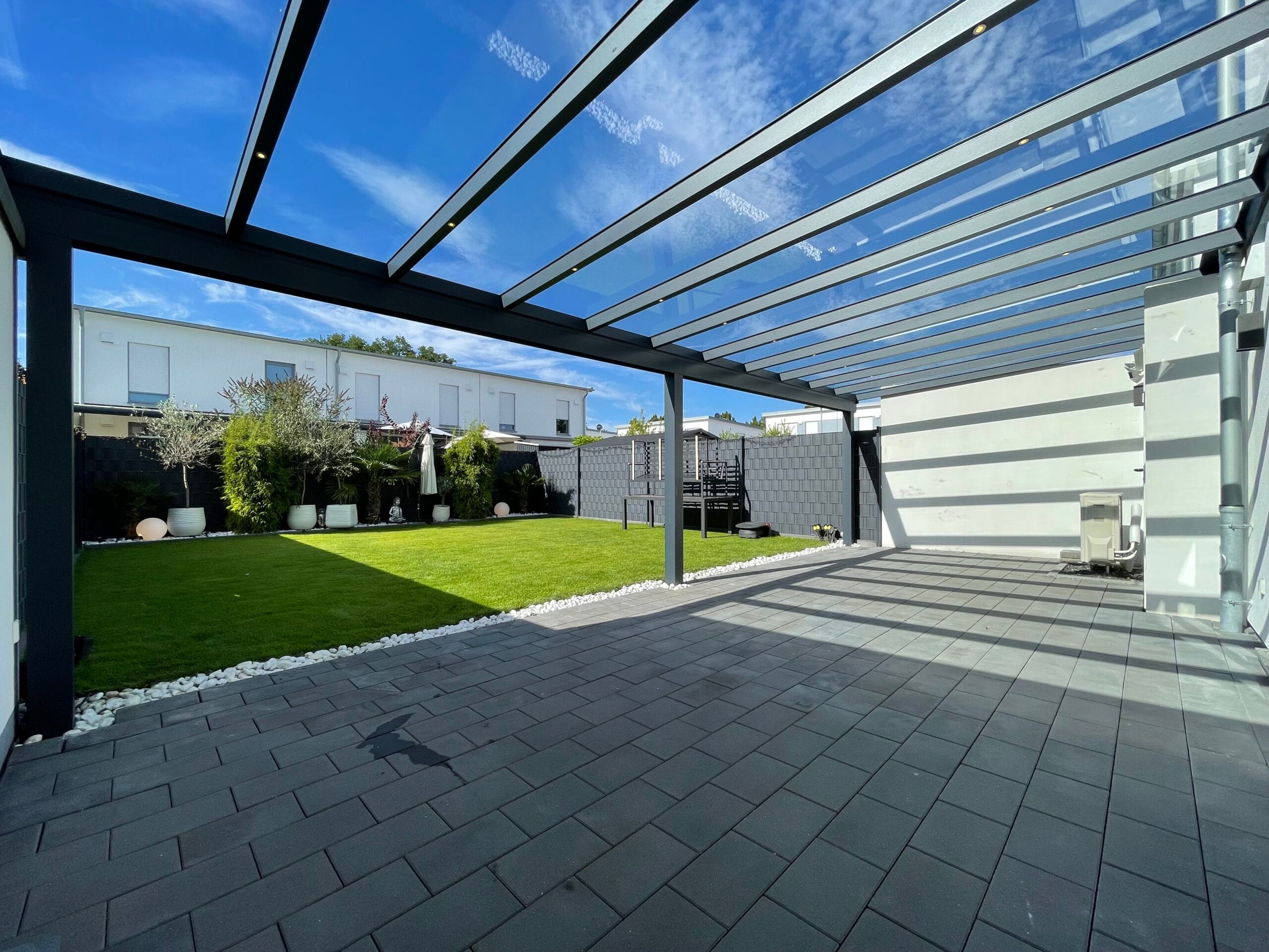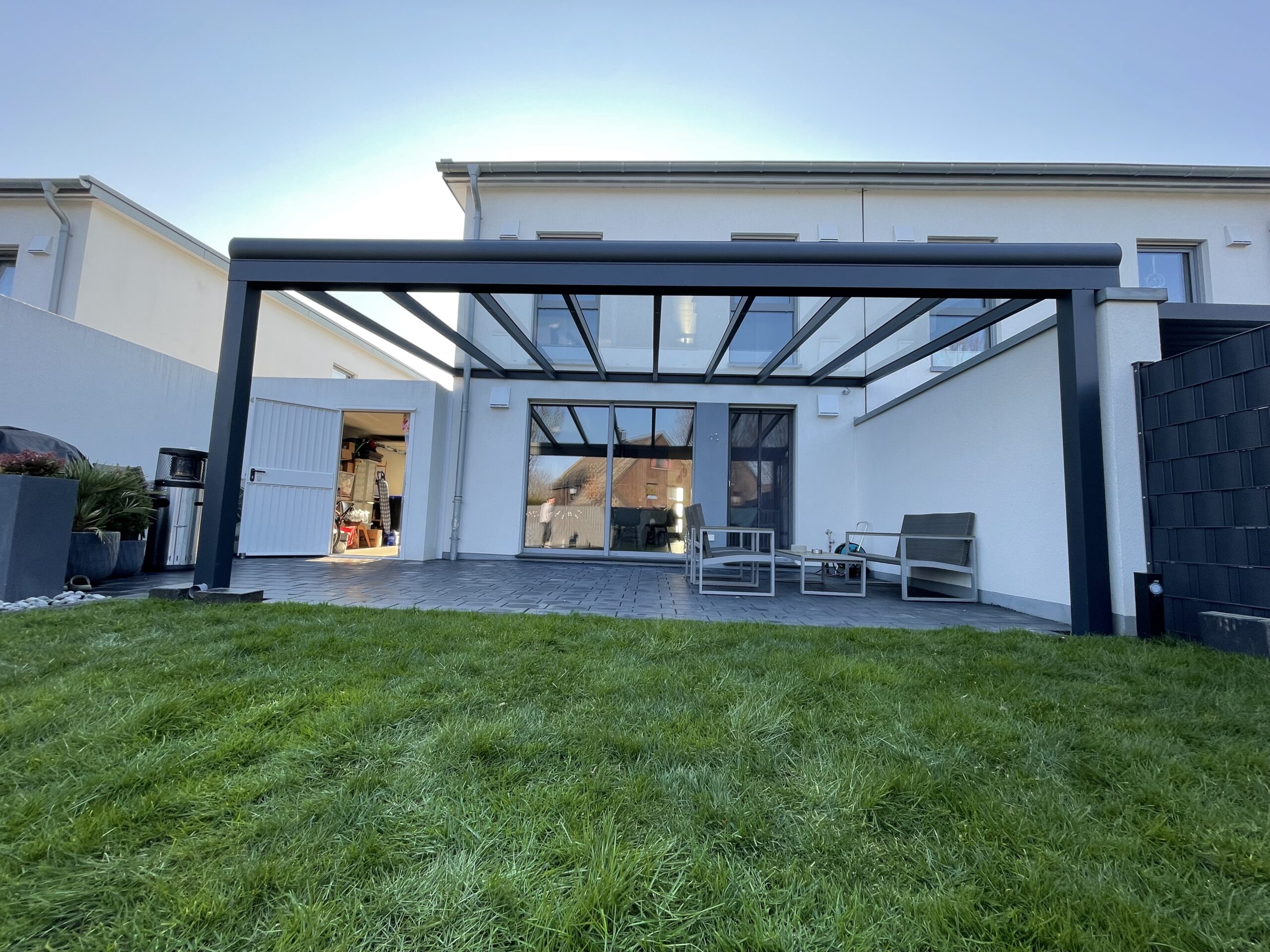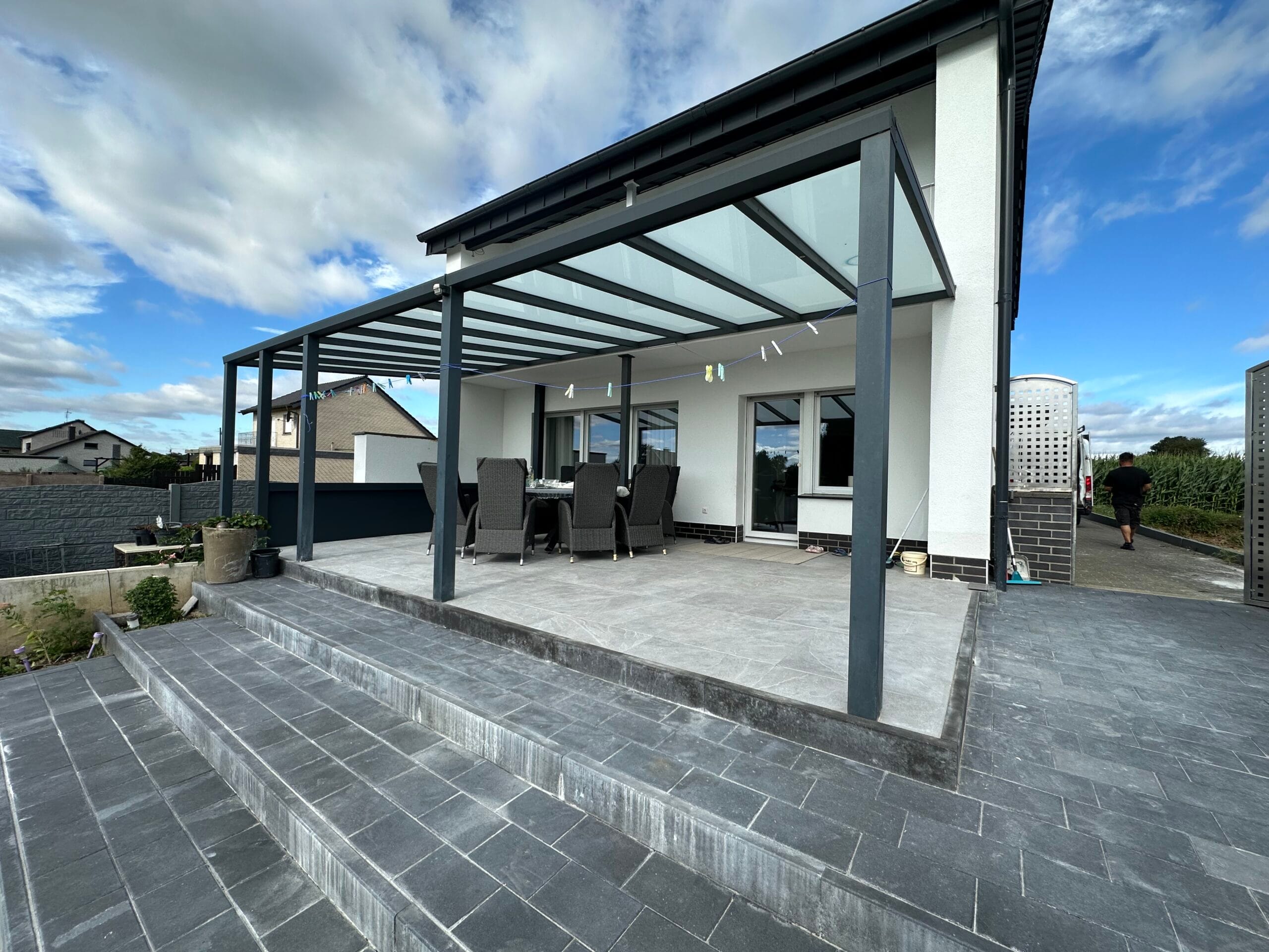 Unsere Terrassenüberdachungen vereinen modernes Design und Funktionalität. Sie sind nicht nur ästhetisch ansprechend, sondern bieten auch eine robuste Struktur mit einem Statikträger von bis zu 7 Metern Breite auf 2 Pfosten. Diese starken Konstruktionen garantieren Stabilität und Langlebigkeit.