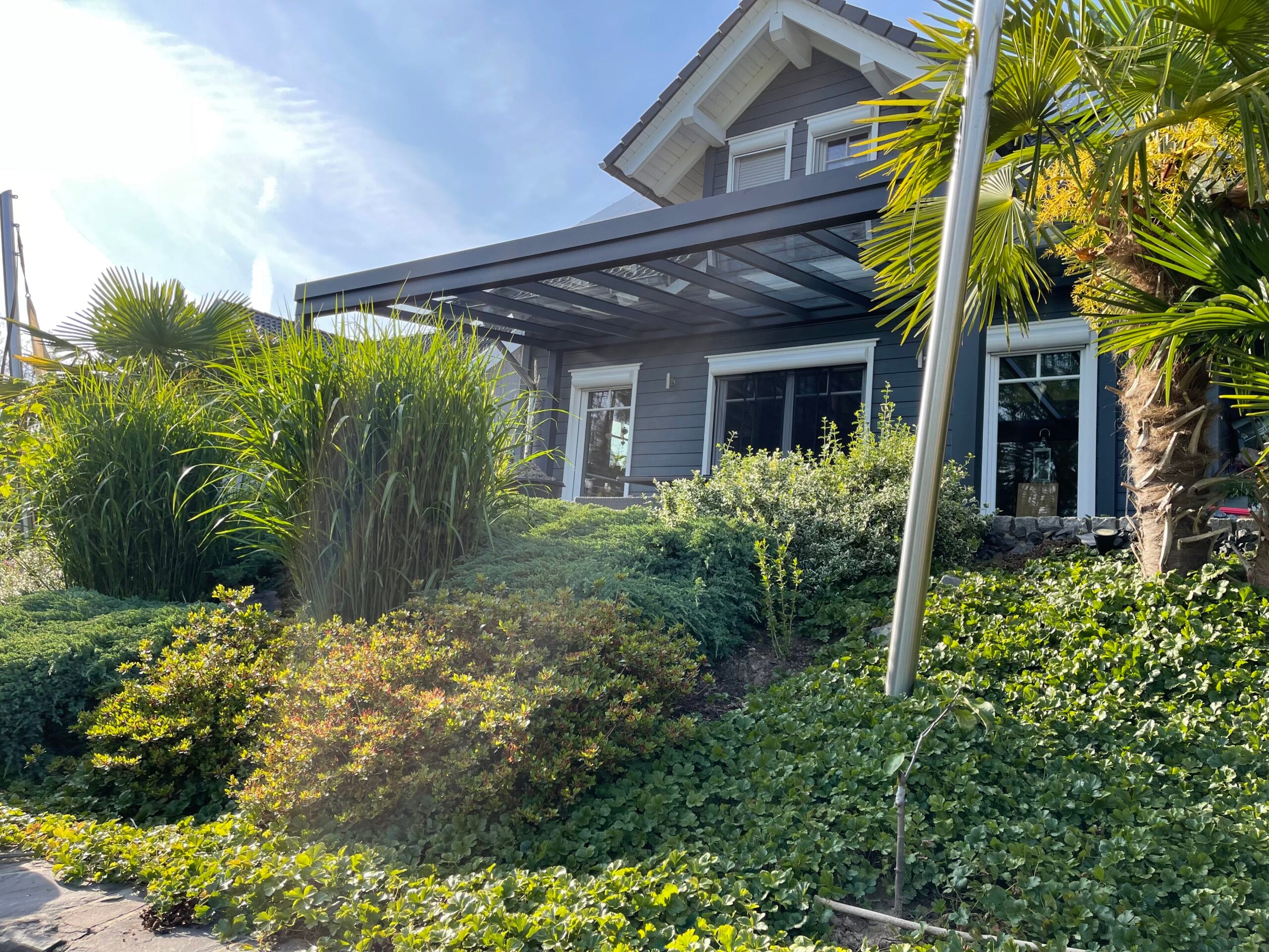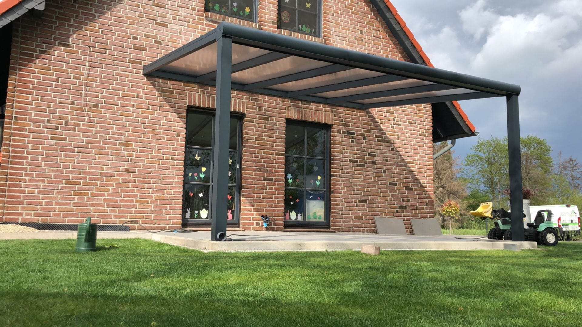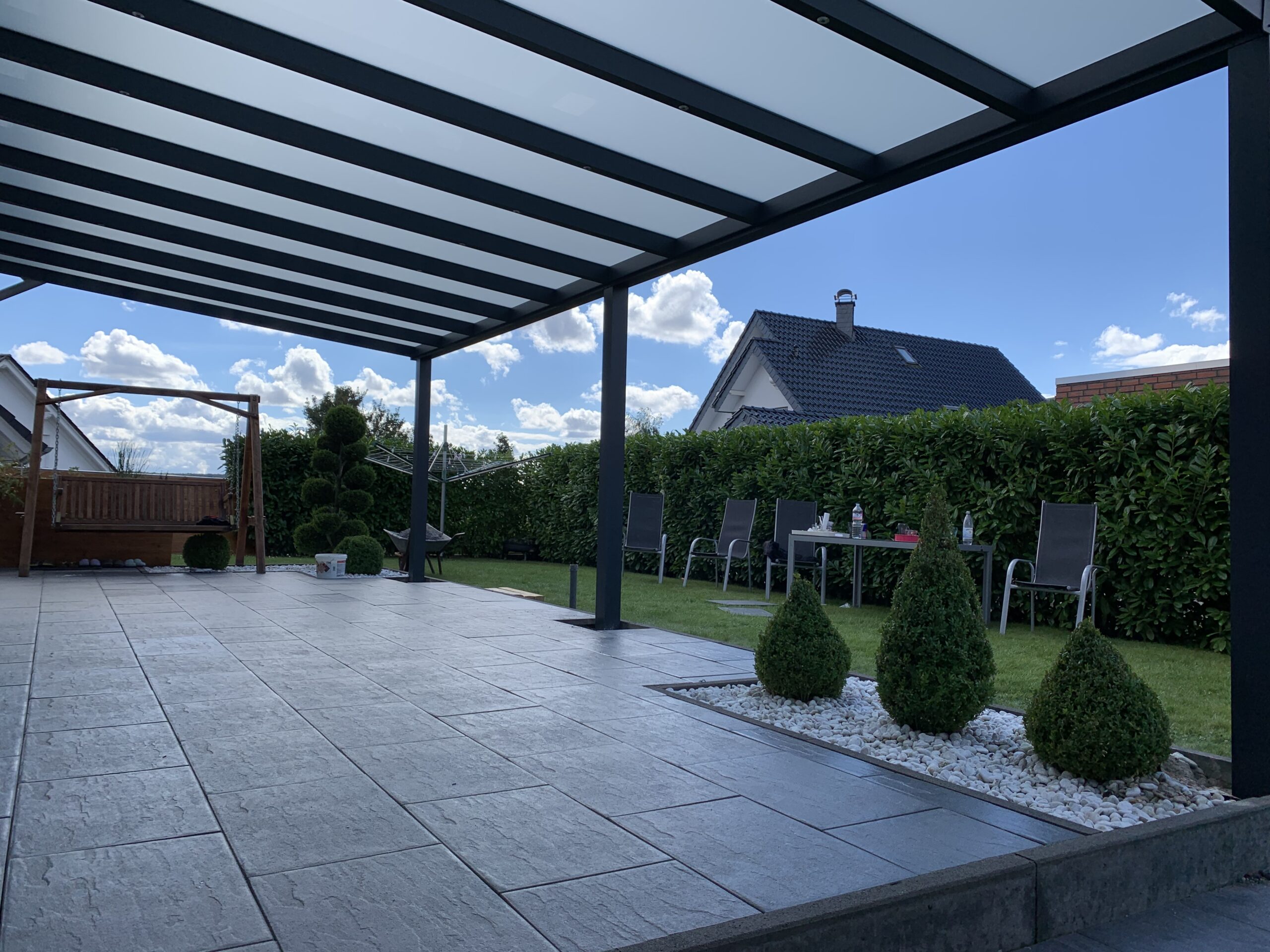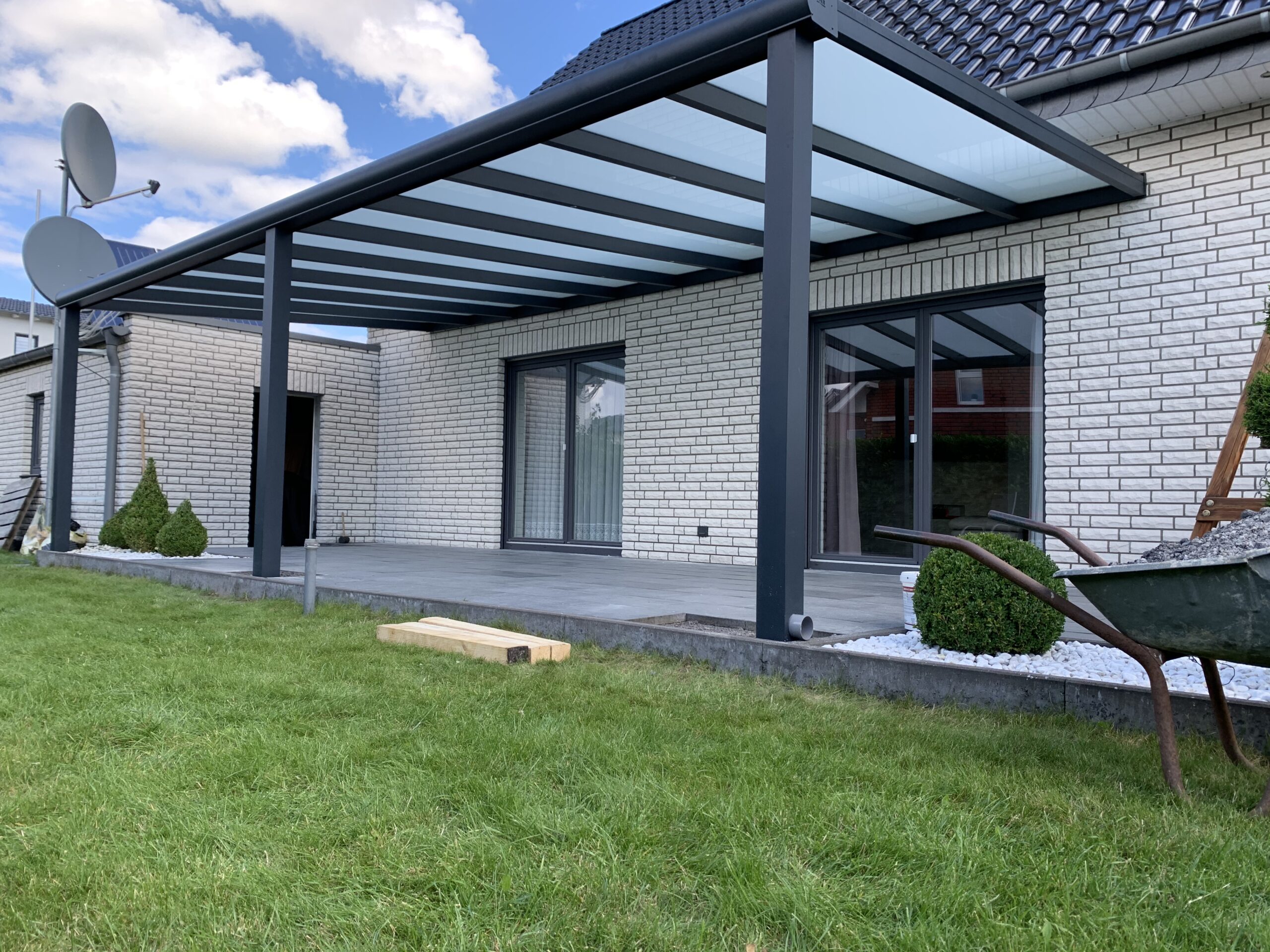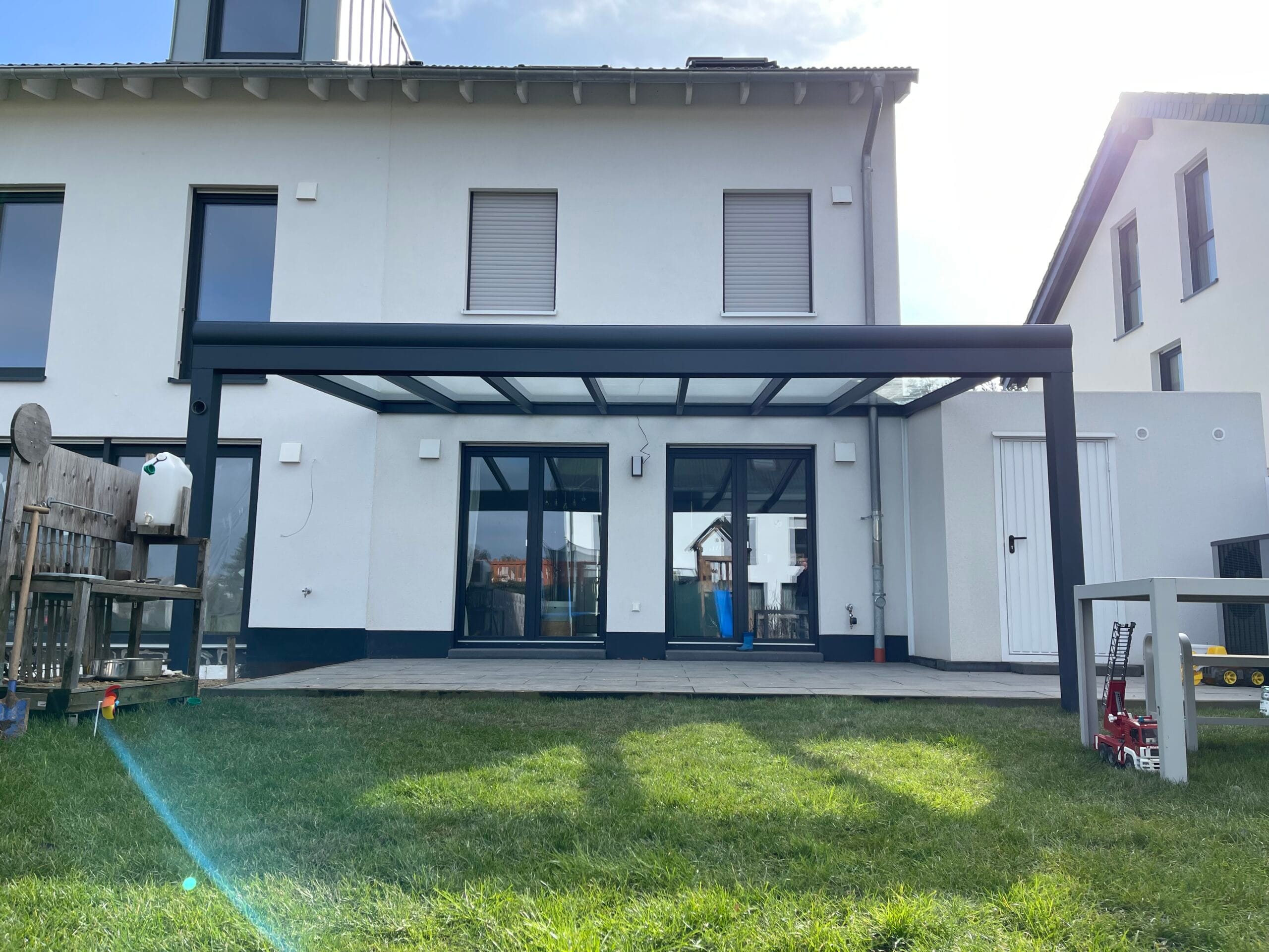 Unsere Terrassenüberdachungen vereinen modernes Design und Funktionalität. Sie sind nicht nur ästhetisch ansprechend, sondern bieten auch eine robuste Struktur mit einem Statikträger von bis zu 7 Metern Breite auf 2 Pfosten. Diese starken Konstruktionen garantieren Stabilität und Langlebigkeit.