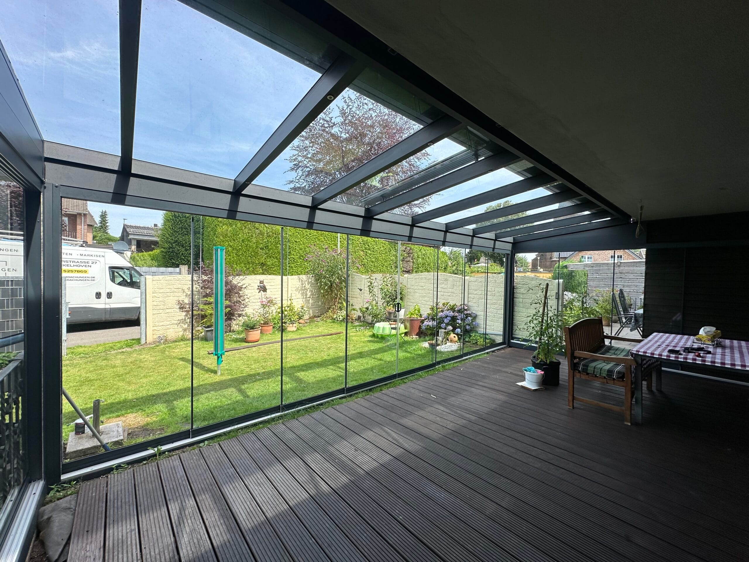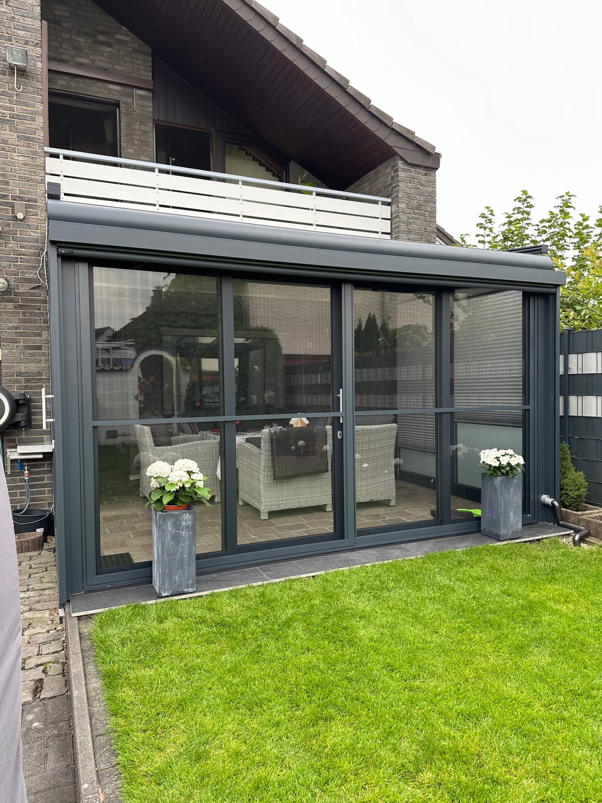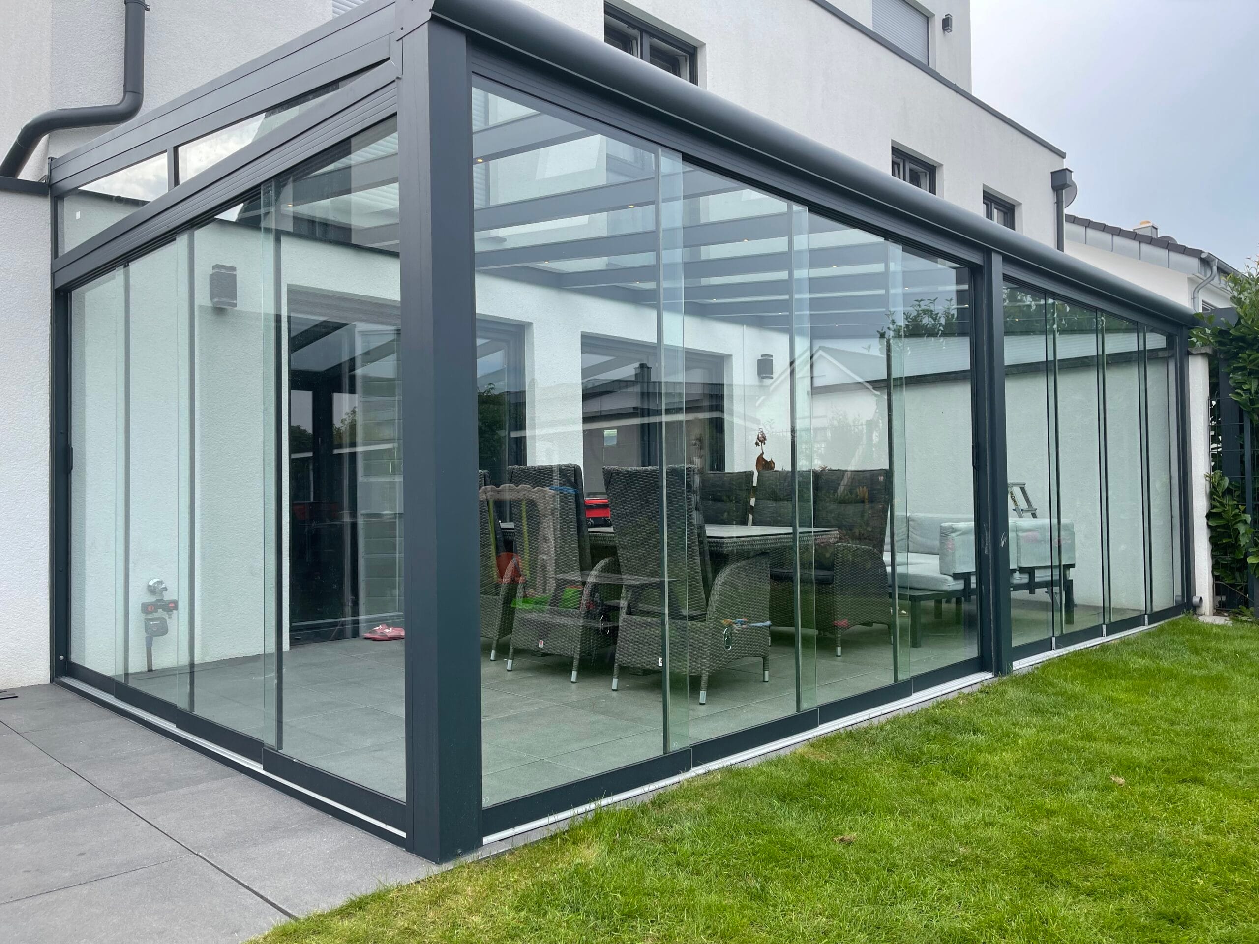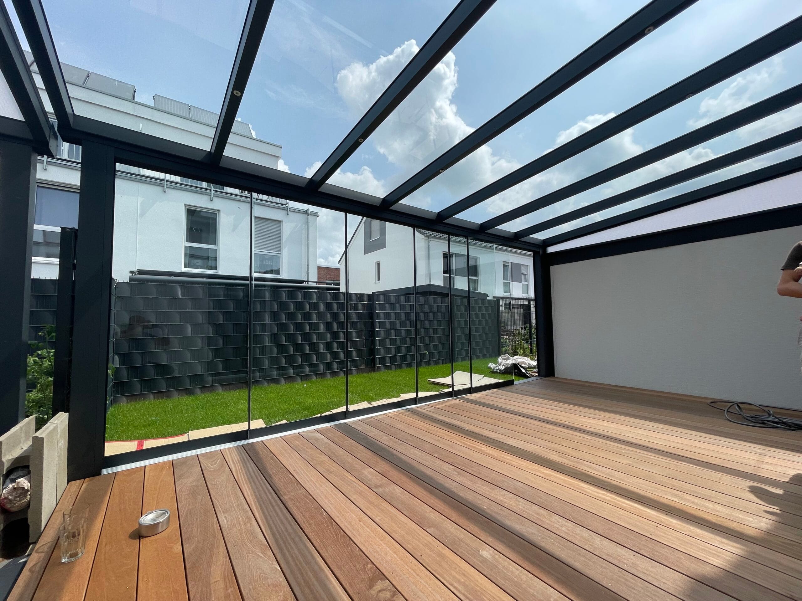Unser flexibles System lässt sich beliebig mit Schiebeelementen erweitern. Darüber hinaus bieten wir praktische Lösungen für Sonnenschutz und Insektenschutz, wie Markisen, um Ihren Komfort zu erhöhen und die Nutzung Ihrer Terrasse zu optimieren.