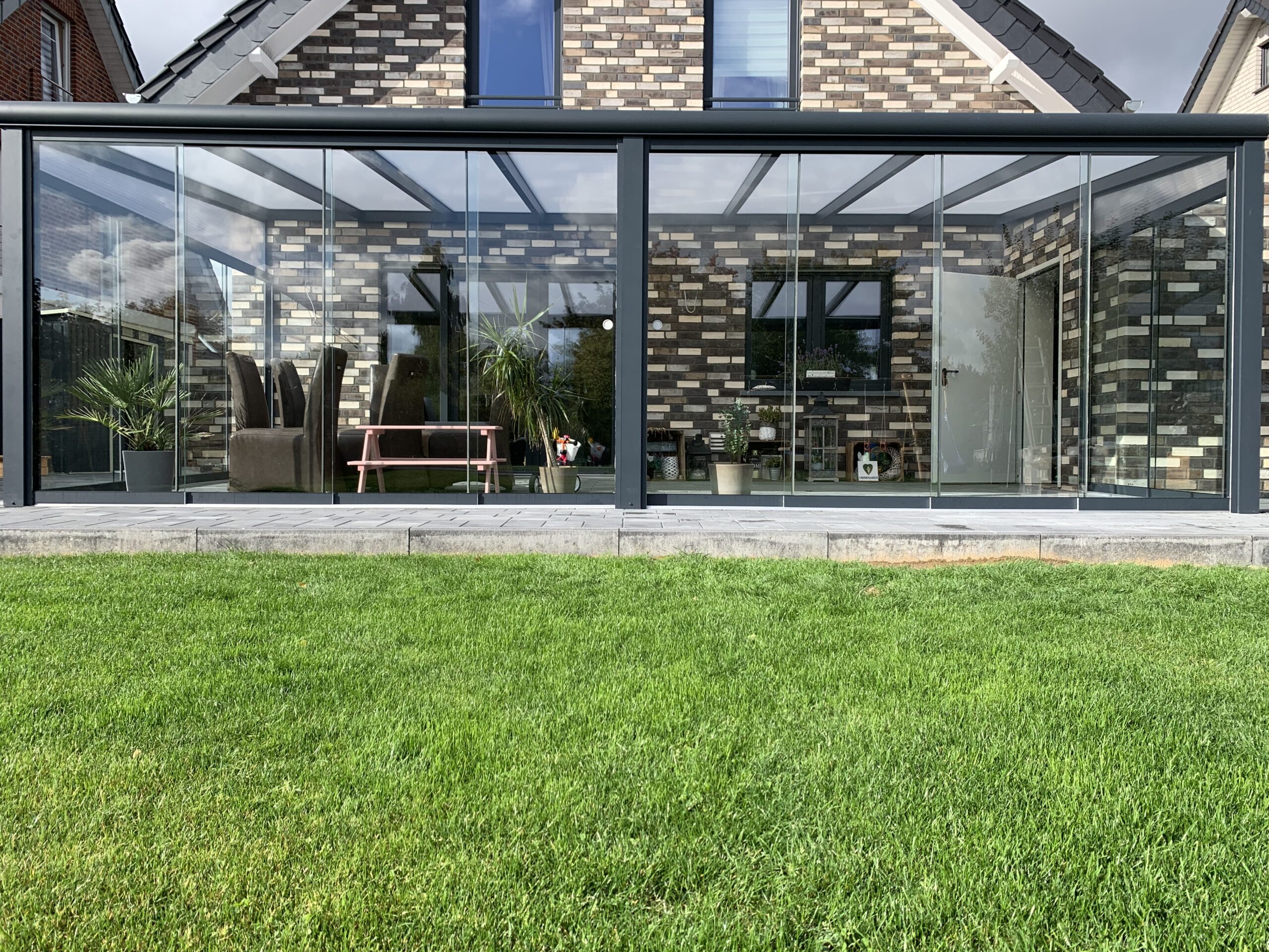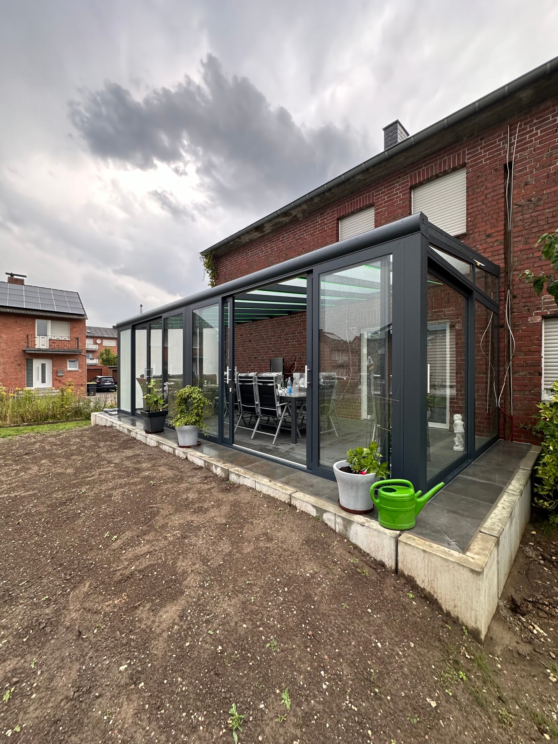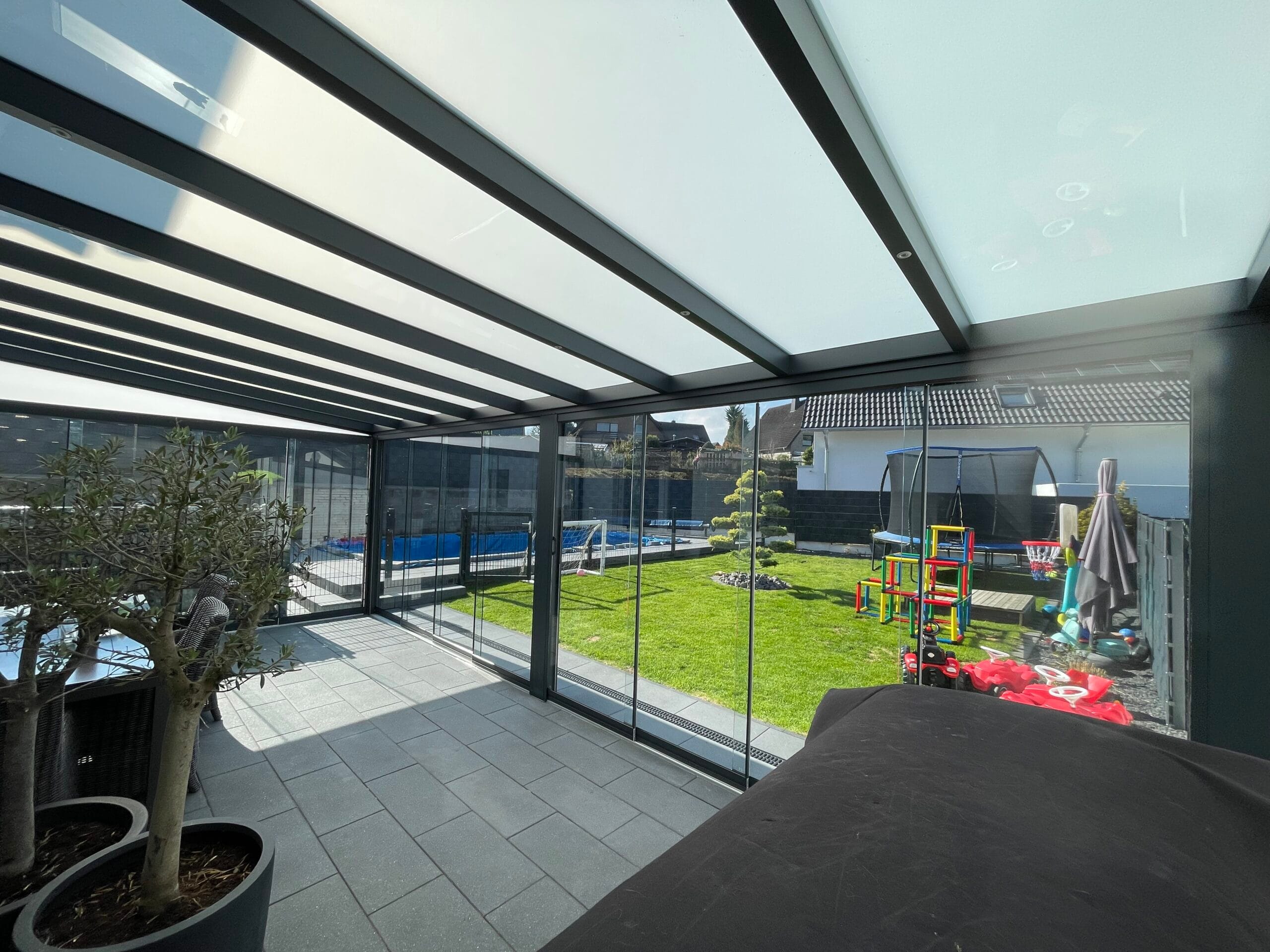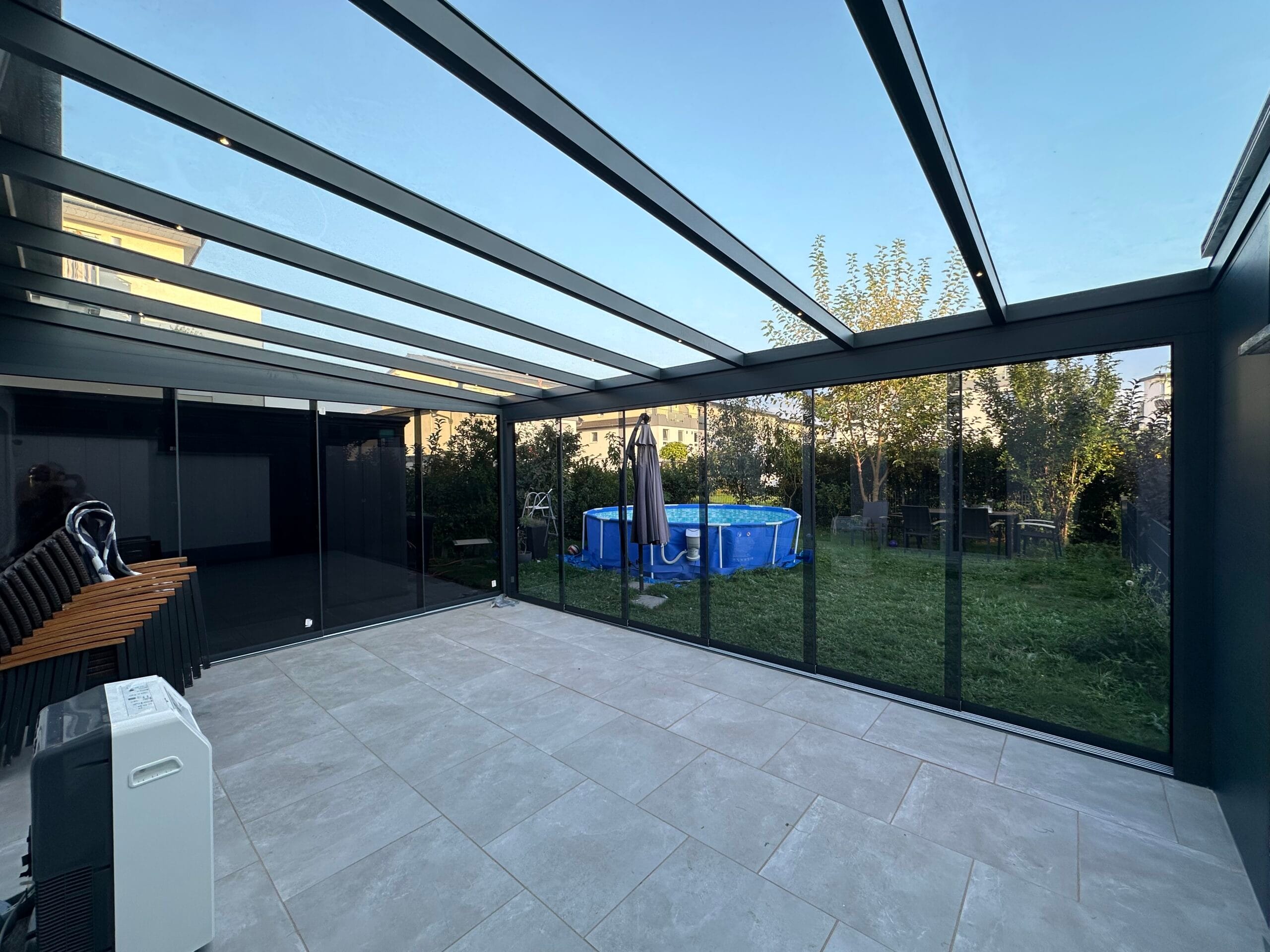 Unser flexibles System lässt sich beliebig mit Schiebeelementen erweitern. Darüber hinaus bieten wir praktische Lösungen für Sonnenschutz und Insektenschutz, wie Markisen, um Ihren Komfort zu erhöhen und die Nutzung Ihrer Terrasse zu optimieren.